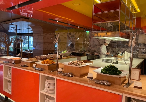 입구에 들어서면 고급스러운 인테리어와 넓은 공간이 먼저 눈에 띕니다. 세련된 조명과 깔끔한 테이블 세팅이 고급 호텔 뷔페다운 품격을 더해줍니다.