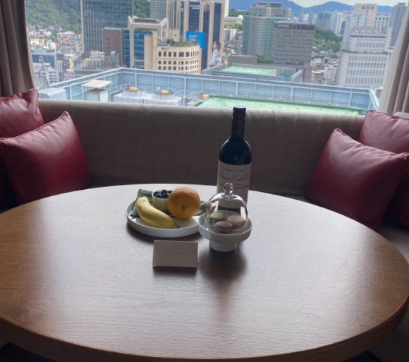 또한, 객실에는 서비스로 제공되는 와인과 과일도 있었는데, 과일 중 블루베리가 특히 맛있었어요. 와인과 함께 이런 소소한 즐거움을 느낄 수 있다는 점이 좋았습니다.