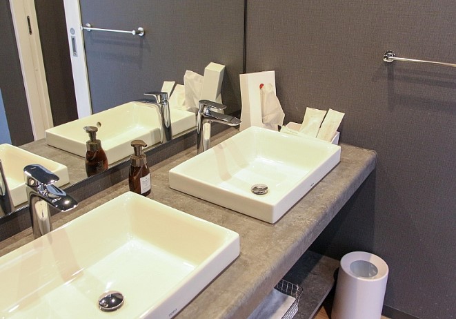 객실은 긴 형태로 되어 있으며, 현관을 열면 왼편에 욕실이 마련되어 있습니다. 욕실에는 세면대 두 개와 미니미 샤워부스가 있으며, 수압이 매우 좋습니다.