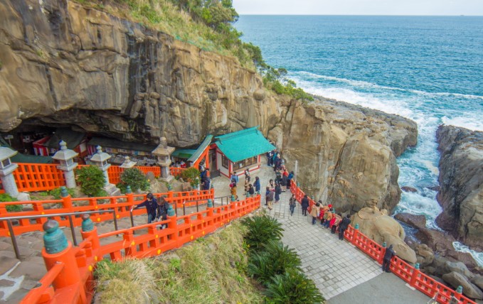 미야자키 현 남부 니치난 해안에 위치한 우도 신궁은 일본에서도 특이한 형태의 신사입니다. 절벽 위에 세워진 이 신사는 파도와 바람, 그리고 붉은 도리이가 어우러져 아름다운 경치를 자아냅니다. 우도 신궁은 특히 결혼, 부부 화합, 순산 기원의 성지로도 유명해 많은 이들이 소원을 빌기 위해 찾습니다.