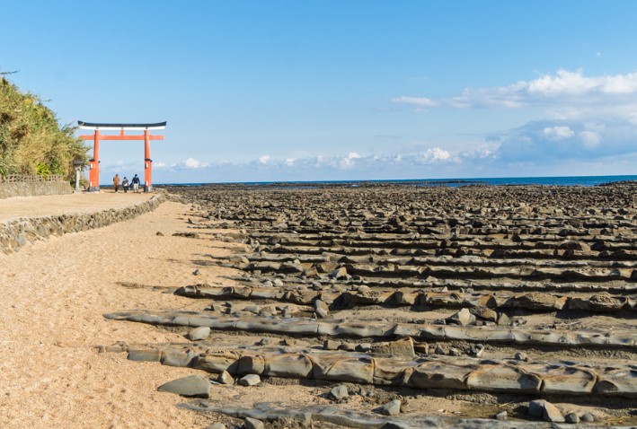 간조 시에는 이 바위 위를 걸을 수 있어, 자연 속에서 즐기는 독특한 체험을 할 수 있습니다. 바위 틈새에서 작은 게와 조개들을 만나는 것도 하나의 재미입니다. 아오시마 신사도 이곳의 매력 중 하나로, 붉은 신전과 함께 남국 휴양지의 정취를 느낄 수 있습니다.