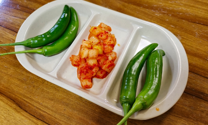 바삭하게 튀겨진 돈까스에 달콤한 소스를 곁들이고, 풋고추와 깍두기가 함께 제공되어 느끼함을 잡아줍니다.