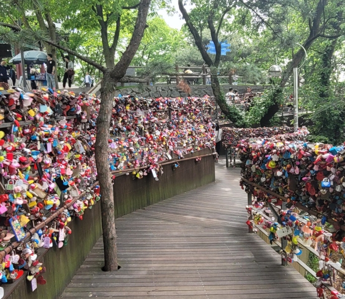 남산타워 하면 빼놓을 수 없는 것이 바로 사랑의 자물쇠. 수많은 연인들이 자신의 이름과 메시지를 적은 자물쇠를 걸어두는 곳으로 유명한데요. 이날도 많은 커플들이 와서 인증샷을 남기고 있었습니다.