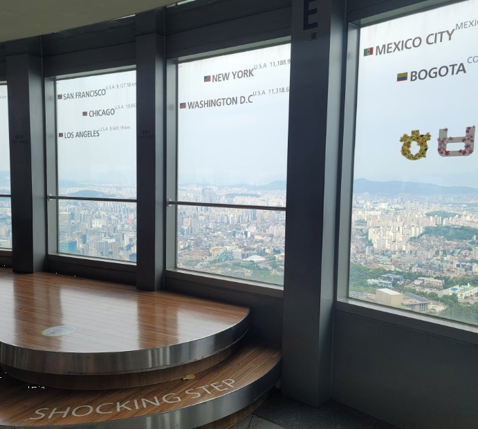 날씨가 맑으면 멀리 청와대까지 선명하게 보아고, 세계 주요 도시들의 거리와 방향이 적혀 있는 창문을 보면서 '내가 가본 도시가 있나?' 찾아보는 재미도 있었습니다.