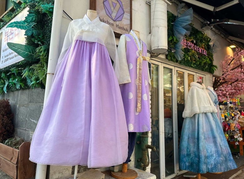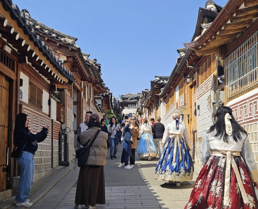 북촌 한옥마을 입구에는 한복 대여점이 많이 있어요. 저는 한복을 입은 외국인 관광객들이 정말 많은 걸 보았어요.