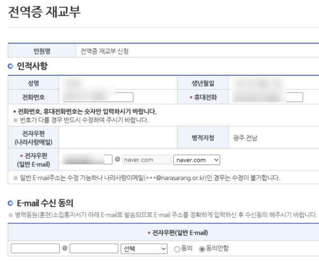 신청서 작성 (군 정보 및 개인 정보 입력)