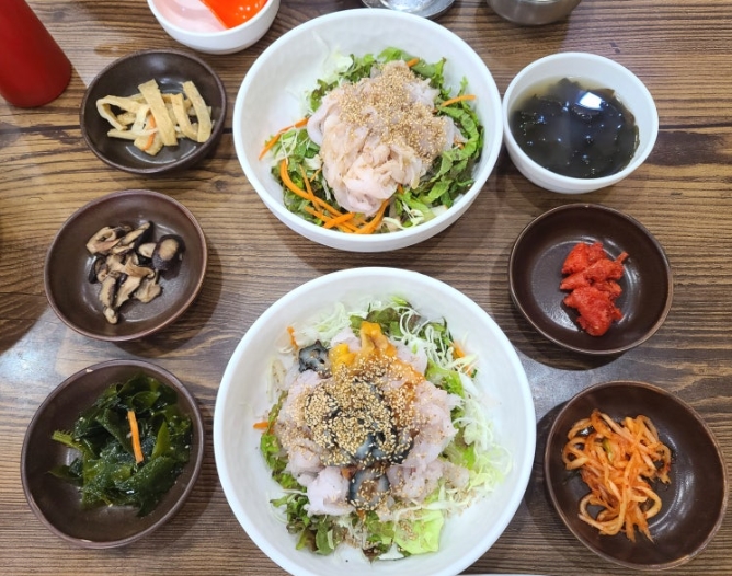 저는 특 모둠 물회(2인분)을 주문했어요. 주문과 동시에 테이블에 따뜻한 밥과 소면, 반찬들이 준비되었는데요. 반찬으로는 어묵, 애호박볶음 등이 나오며, 멸치볶음은 제공되지 않았어요.