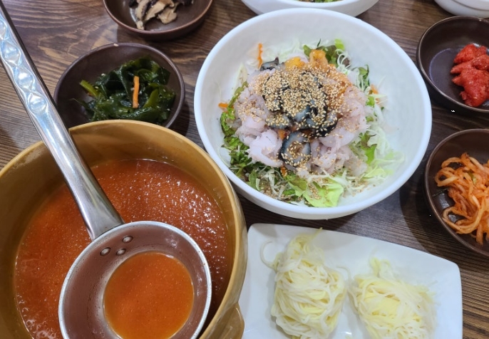 물회는 세꼬시, 해삼, 멍게, 전복이 듬뿍 들어간 푸짐한 구성이었고, 국물은 새콤하면서도 감칠맛이 살아있어 밥과도, 소면과도 환상적인 조합이었어요.