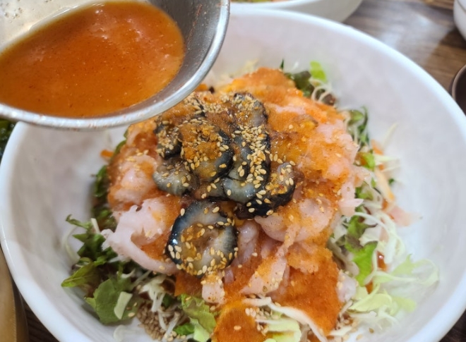 사장님께서 직접 물회 육수를 한 스푼 반 정도 넣는 것이 적당하다고 설명해 주셨어요. 초장에 찍어 먹어도 맛있고, 육수를 넣어 시원하게 즐기는 것도 좋았습니다.