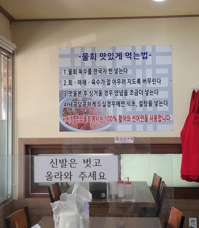 영금물회는 100% 활어와 선어만을 사용하기 때문에, 신선한 해산물을 맛볼 수 있는 곳이에요. 오픈 시간인 10시가 되자마자 손님들이 몰리는 것을 보고 이곳의 인기를 실감할 수 있었어요.