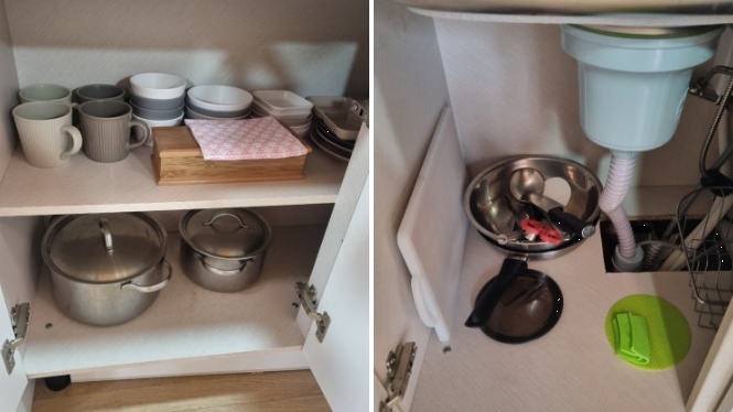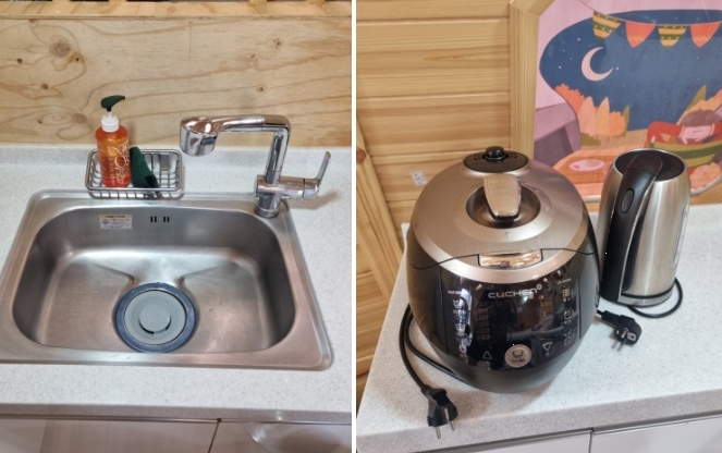 주방 공간에는 냄비, 밥솥, 전기포트, 다양한 크기의 그릇, 물컵, 도마, 칼, 수저 세트 등 기본적인 조리 도구가 구비되어 있어 따로 챙겨 오지 않아도 부담 없이 사용할 수 있었습니다.