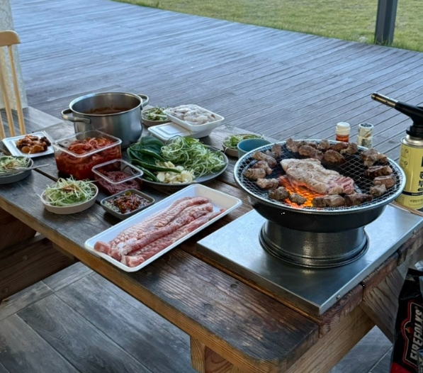 밤이 되자 가져온 캠핑 용품들을 숙소 앞에 펼쳐놓고 바비큐를 즐겼습니다.