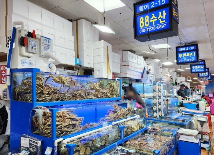 노량진 수산시장에 가면 수많은 수산물 매장이 있는데요. 저는 오늘 88수산(활어 2-15번 매장)에서 대게를 구매했습니다. 이곳은 신선한 해산물과 푸짐한 서비스로 유명해요.