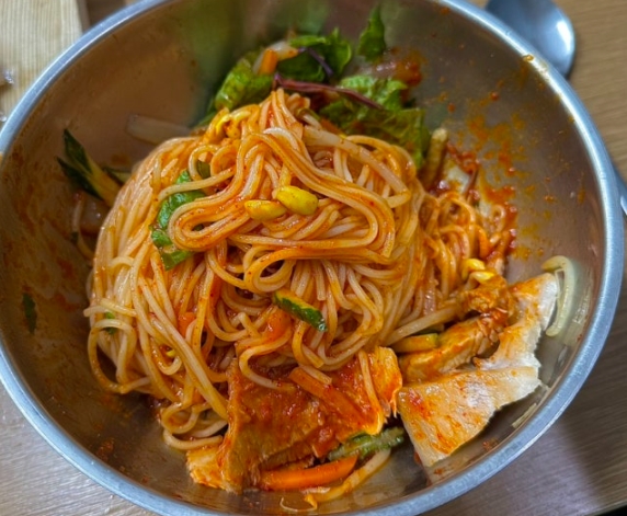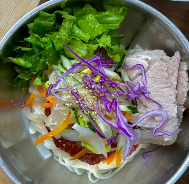 비빔국수는 제가 평소에도 좋아하는 메뉴예요. 양배추, 오이, 양파, 당근으로 알록달록 고명이 올라가 있어서 먹기 전부터 기대되는 비주얼이었어요.