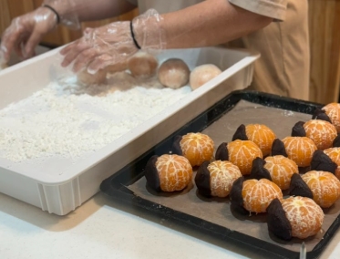 마침 가게에서 감귤모찌를 만드는 모습을 볼 수 있었어요. 반죽을 얇게 펴서 귤을 하나하나 싸는 과정이 너무 신기했어요.