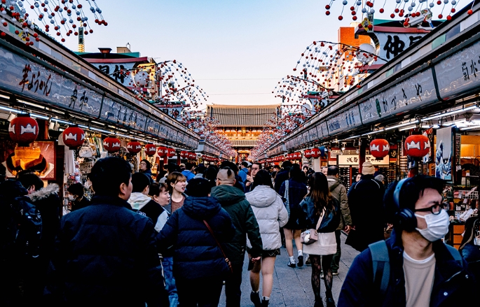 센소지 본당은 닫혀 있지만, 오미쿠지와 같은 기념품 구매는 여전히 가능하며, 저녁 시간에도 여전히 많은 방문객들로 북적입니다.