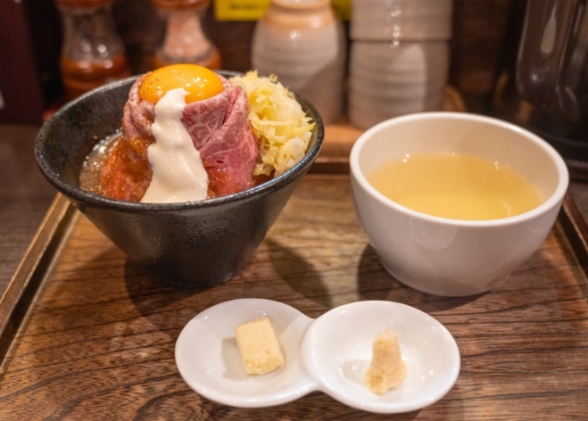 메뉴는 단순합니다. 로스트 비프 덮밥 정식 두 종류와 샐러드가 전부인데요. 저는 구로게 와규 로스트 비프 덮밥 정식을 주문했어요.
