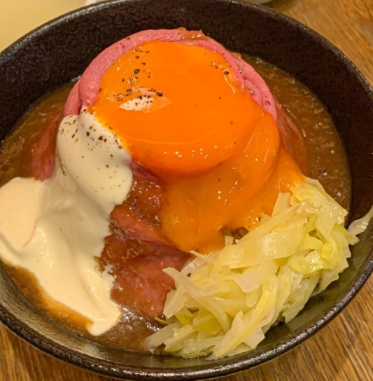 음식이 나왔을 때, 비주얼은 정말 끝내줬어요. 밥 위에 로스트비프가 쌓이고, 그 위에 계란 노른자가 톡 올라가며, 옆에는 약간의 야채와 마요네즈, 그리고 선택한 소스가 촤르르 올라갑니다