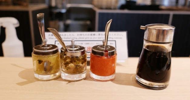 테이블 위에는 함바그에 곁들일 소스 3가지가 준비되어 있었어요. 이 소스들은 느끼함을 잡아주는 역할을 해서 정말 맛있었어요.