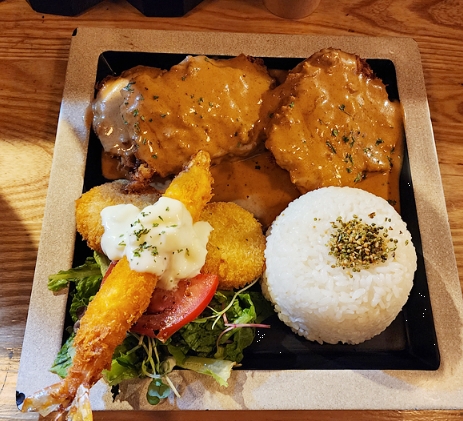 두툼한 돈까스 + 새우튀김 + 감자고로케 + 샐러드 구성 하나의 세트 안에 다양한 튀김 요리가 포함되어 있어서, 골라 먹는 재미가 있었어요. 돈까스를 기본으로, 바삭한 새우튀김과 부드러운 감자고로케까지 포함된 구성이어서 정말 푸짐하게 즐길 수 있었어요.