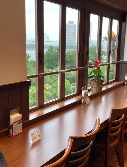 주문 후 자리를 안내받았는데, 마침 창가 자리로 배정. 창밖으로 오다이바 자유의 여신상과 레인보우 브릿지가 한눈에 보이는 완벽한 뷰였어요.