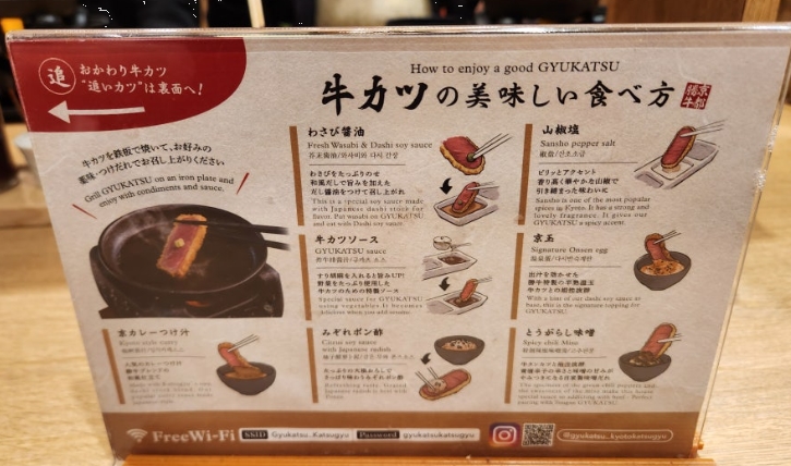 주문을 마치고 기다리는 동안 테이블에 비치된 맛있게 먹는 방법 안내문을 읽어봤어요. 교토가츠규는 고객이 직접 원하는 만큼 익혀서 먹는 방식이라 돌판 화로가 함께 제공되는데, 이걸 잘 활용해야 제대로 된 규카츠를 즐길 수 있어요.