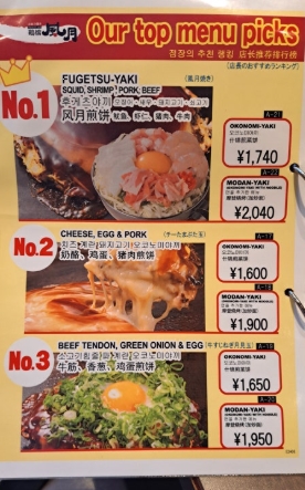 메뉴판에는 한국어 안내도 있어서 주문이 한결 쉬웠어요. 저는 후게츠야끼 (오코노미야끼), 오므라이스 야끼소바, 아사히 생맥주를 주문했어요.