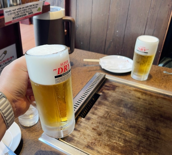 맛있는 음식에는 시원한 맥주가 빠질 수 없죠. 이곳에서 마신 아사히 생맥주는 정말 부드러웠어요. 차갑고 크리미한 거품이 인상적이었고, 짭짤한 야끼소바 & 단짠 오코노미야끼와 찰떡궁합이었어요.
