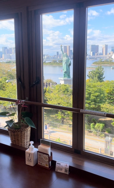 주문 후 자리를 안내받았는데, 마침 창가 자리로 배정. 창밖으로 오다이바 자유의 여신상과 레인보우 브릿지가 한눈에 보이는 완벽한 뷰였어요.