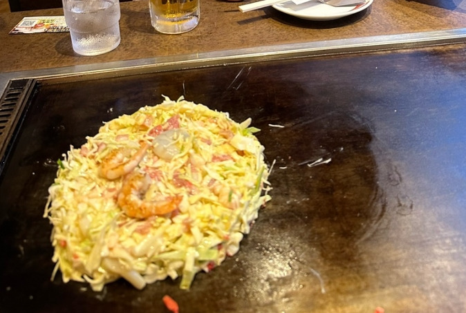 직원이 처음부터 끝까지 반죽을 굽고, 양배추와 돼지고기, 해산물을 넣어 완성해 주더라고요.