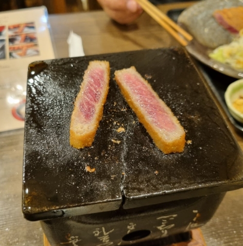고기는 앞뒤로 구우면서, 자신이 원하는 정도로 익혀서 먹을 수 있어 더욱 맛있습니다. 저는 규카츠를 정말 좋아해서, 구워서 먹는 이 재미가 정말 좋았어요.