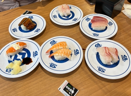 초밥은 1접시 150엔, 두 피스가 기본이며, 고급 초밥은 200엔에서 300엔대로 제공됩니다. 가격대가 저렴하면서도 맛있어서 부담 없이 여러 종류의 초밥을 맛볼 수 있었습니다. 저는 연어, 참치, 생새우, 한치, 달걀 초밥을 다양하게 주문해 봤는데, 모두 신선하고 맛있었습니다.
