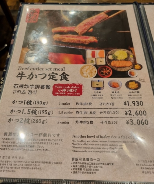 저는 규카츠 단품을 1,630엔에 주문했어요. 한국에서는 2만 원 정도에 먹을 수 있는 가격대인데, 일본에서는 훨씬 저렴하게 즐길 수 있어 좋았습니다