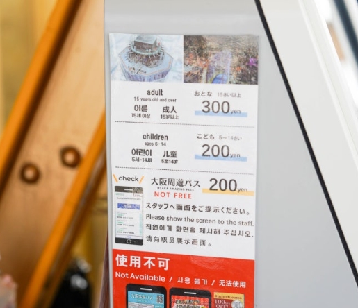 저는 주유패스를 이용했는데, 이 패스를 이용하면 전망대와 타워 슬라이드 모두 무료로 이용할 수 있어 정말 좋았어요. e패스도 비슷한 혜택을 제공하니, 오사카를 자주 방문하는 분이라면 패스를 미리 구입하는 것이 매우 경제적입니다.