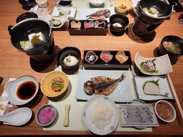 아침에는 전날 저녁과 동일한 룸에서 조식을 즐길 수 있었습니다. 정갈한 한상으로 제공된 일본식 조식은 두부가 특히 맛있었습니다.