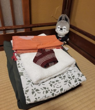 객실에는 유카타와 수건이 준비되어 있었고, 발코니와 냉장고도 갖추어져 있습니다.
