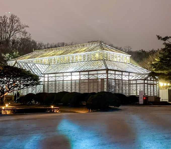 해가 지고 어둠이 내리면서 궁궐이 점점 더 신비로운 분위기로 바뀌는 게 느껴졌습니다. 입구에서 표를 끊고 들어가니, 멀리서 은은하게 빛나는 대온실이 보이더라고요. 야간 조명이 들어온 궁궐은 낮과는 전혀 다른 매력이었어요.