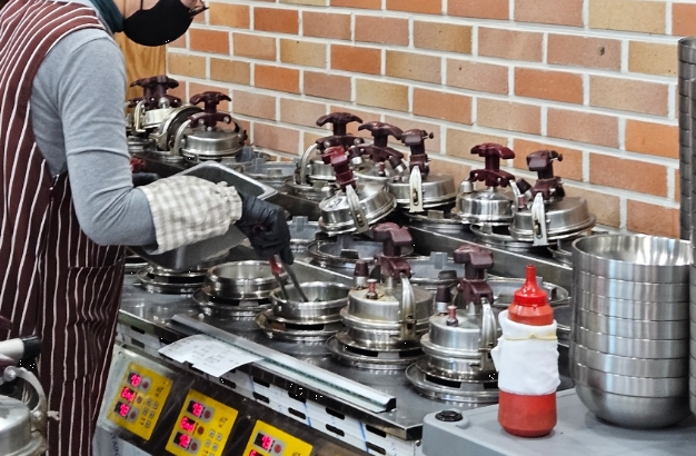 식당 안으로 들어가자마자 가장 먼저 눈에 들어온 것은 분주하게 움직이는 주방과 가득 찬 테이블이었어요.