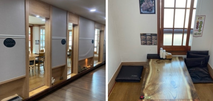 4인석 테이블이 대부분을 차지하고 있었어요. 6인 단체석과 룸도 마련되어 있어 단체 모임도 가능해 보였어요. 전체적으로 깔끔하고 따뜻한 분위기의 한정식집이었어요.