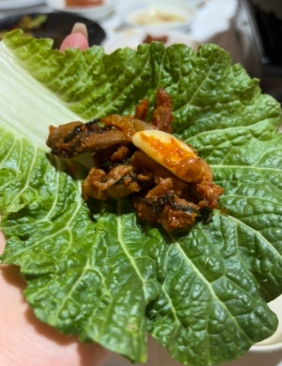 사장님께서 직접 제공해주신 야채과 함께 싸서 먹으니 그 신선함이 더해져, 기름진 맛을 잡아주면서도 깔끔한 마무리를 선사했습니다.