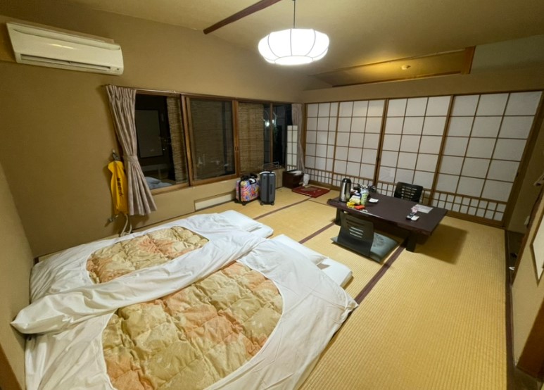 다행히도 객실의 층고는 높아 답답함 없이 편안하게 지낼 수 있었습니다. 저녁 시간대에는 이불이 이미 깔려 있었고, 이불 덕분에 따뜻하고 편안한 잠자리를 제공받을 수 있었습니다.