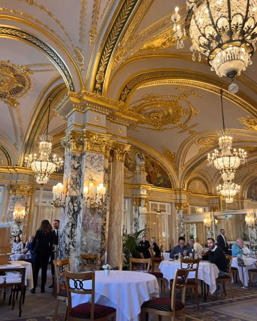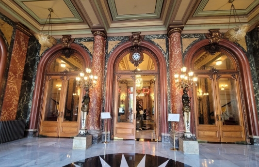 입구에 들어서자마자, 반짝이는 금빛 샹들리에와 고풍스러운 인테리어가 맞이해주죠.