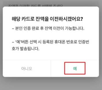 잔액이 있는 카드를 선택 후 잔액 이전 클릭