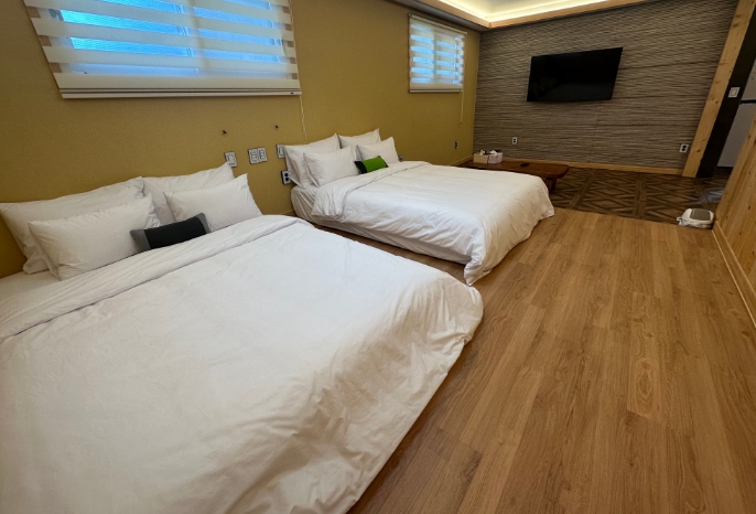 가족탕 내에는 더블 침대 두 개가 나란히 놓여 있어 넉넉한 수면 공간을 제공합니다. 침구는 호텔급 퀄리티로 보들보들한 촉감이 인상적이었고, 침대 옆에는 작은 협탁과 스탠드 조명이 있어 밤에도 편안한 분위기를 조성해주었습니다. 무엇보다 바닥 난방이 되어 있어 겨울철에도 발이 시리지 않고 따뜻하게 쉴 수 있어 좋았습니다.