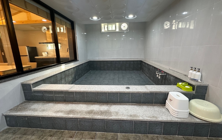 온천탕은 약 2~3인이 동시에 들어갈 수 있는 넉넉한 크기였습니다. 물을 따로 데우지 않아도 될 정도로 온천수 자체가 따뜻하고 피부에 닿는 느낌이 너무 부드러웠어요.