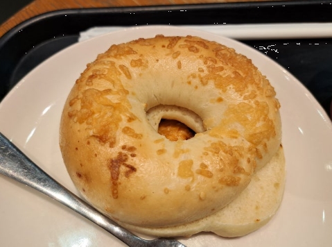 베이글 위에 파마산 치즈가 듬뿍 올라가 있어 첫 입부터 깊은 치즈 맛이 퍼집니다.