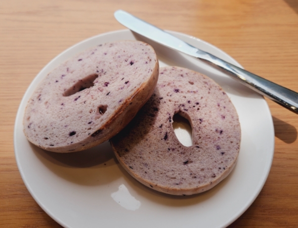 일반 블루베리 빵보다 더 쫄깃하고 촉촉해서 단독으로 먹어도 좋고, 크림치즈와 함께 먹으면 더할 나위 없이 맛있어요.