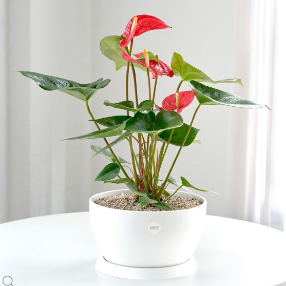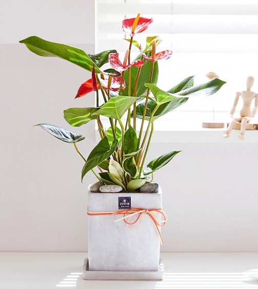 안시리움은 빨간색, 분홍색 꽃이 화려한 공기 정화 식물이에요. 반짝이는 잎사귀와 강한 생명력 덕분에 사무실이나 매장 인테리어에 잘 어울려요."새로운 출발을 희망으로 가득 채우라"는 의미도 있어 개업식 선물로 안성맞춤.