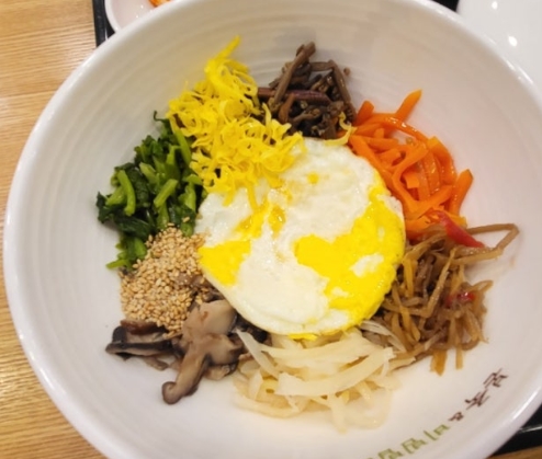 이름에서 알 수 있듯이 신선한 나물이 가득 들어간 비빔밥인데요. 시금치, 고사리, 도라지 등 다양한 나물이 들어 있어 색감도 알록달록 예쁘고 건강한 느낌이 가득했어요. 계란 프라이도 적당히 익혀져 있어, 노른자를 톡 터트려 비벼 먹기 딱 좋더라고요.