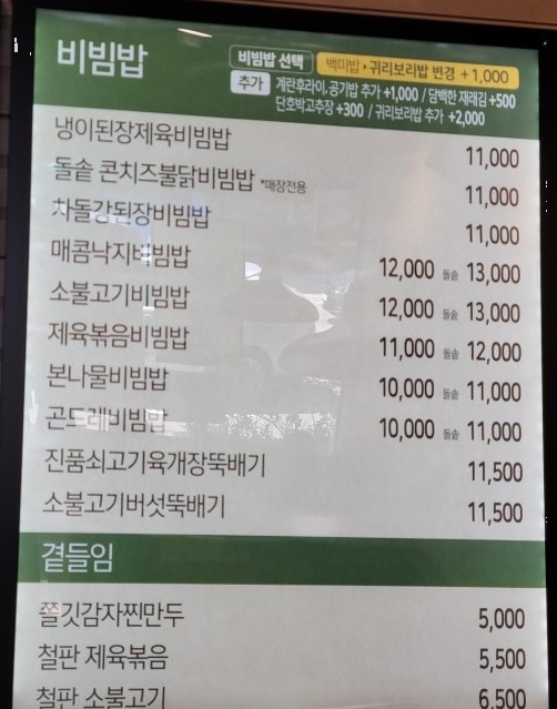 특히, 일반적인 비빔밥보다 단호박 고추장이나 강된장 같은 특제 양념을 활용해 차별화를 둔 점이 좋았어요. 또한, 나물 반찬이나 국도 함께 제공되어 더욱 든든한 한 끼를 즐길 수 있었습니다.